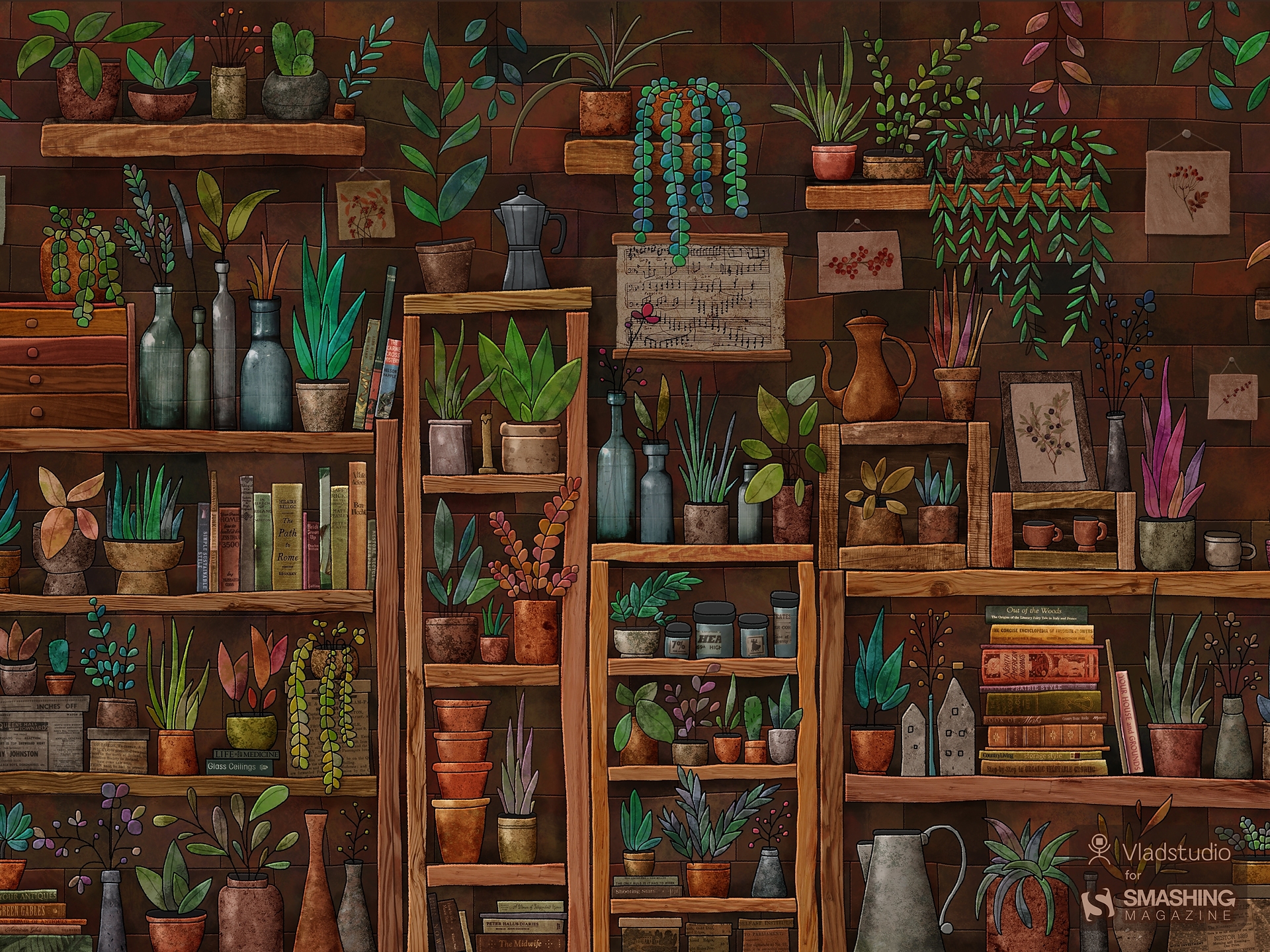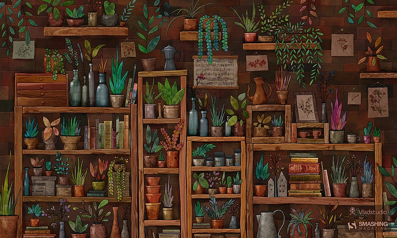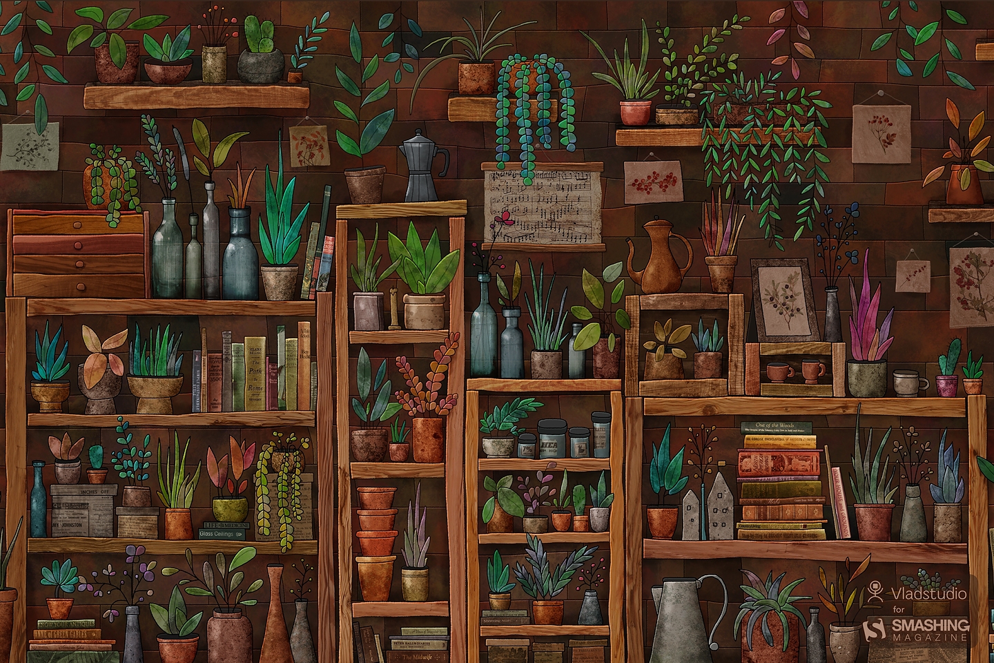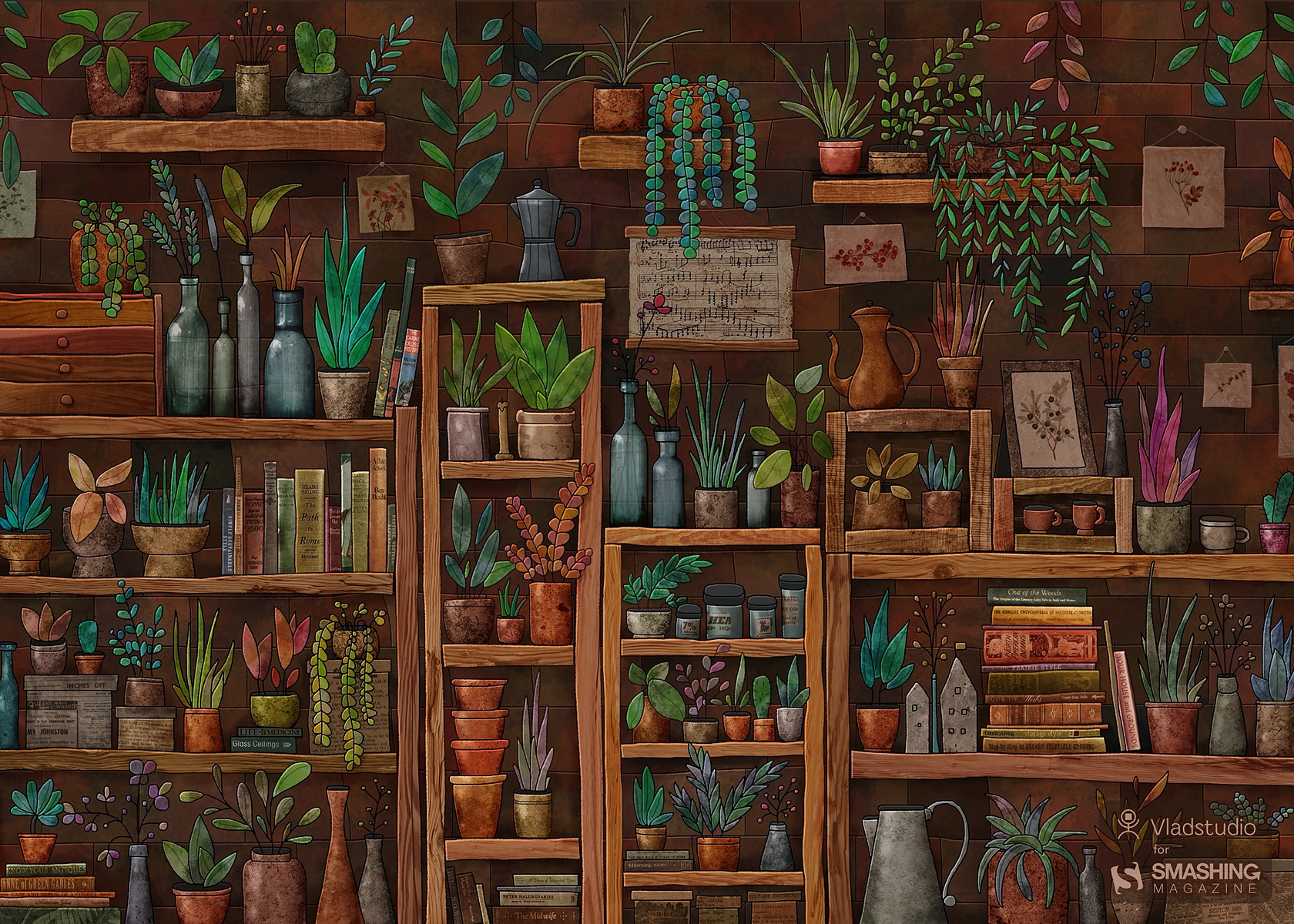 I wanted to draw some very cozy place, both realistic and cartoonish, filled with little details. A space with a slightly unreal atmosphere that some great shops or cafes have. A mix of plants, books, bottles, and shelves seemed like a perfect fit. I must admit it took longer to draw than most of my other pictures! But it was totally worth it. Watch the making-of. — Designed by Vlad Gerasimov from Georgia.