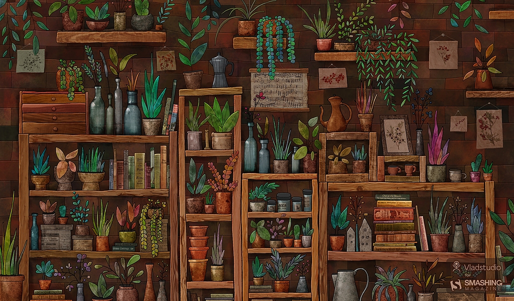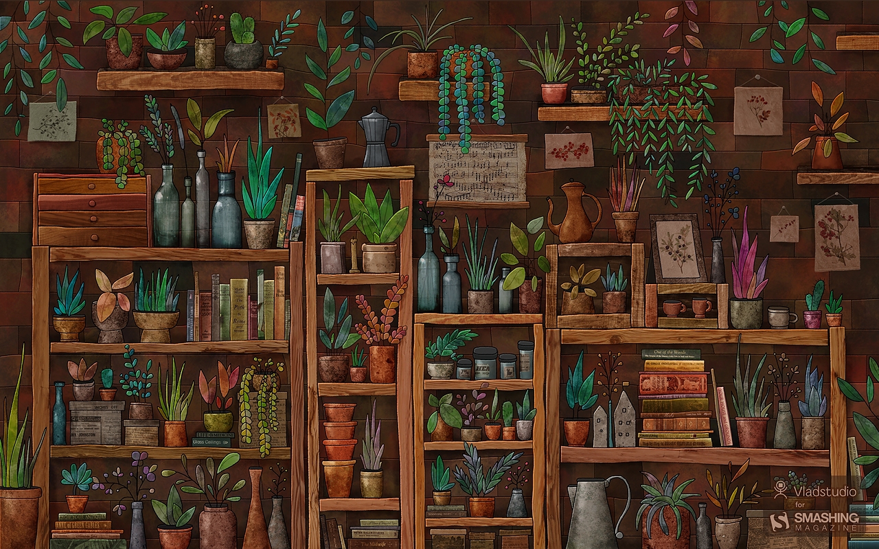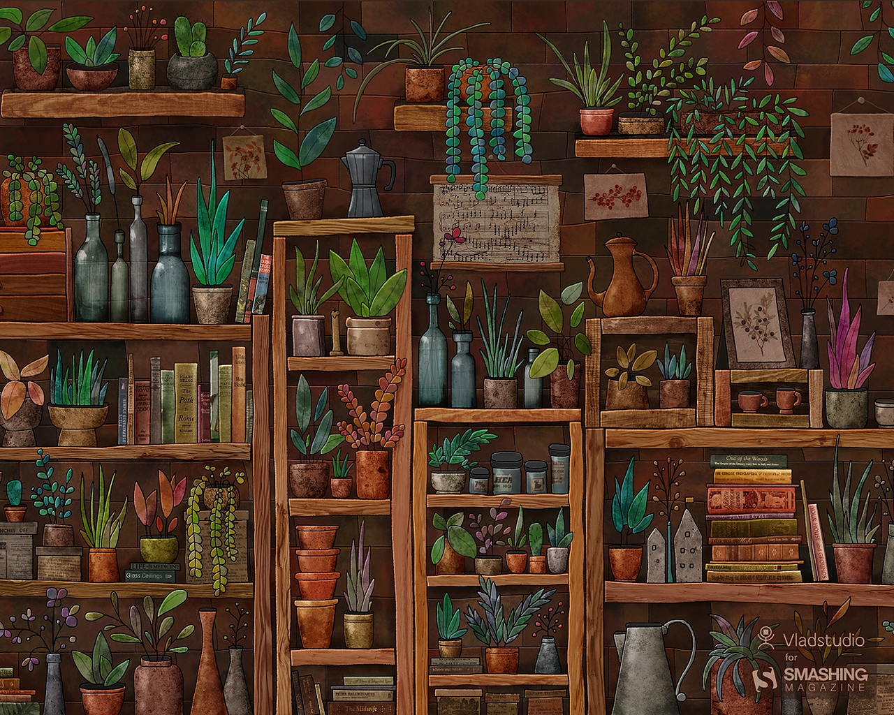I wanted to draw some very cozy place, both realistic and cartoonish, filled with little details. A space with a slightly unreal atmosphere that some great shops or cafes have. A mix of plants, books, bottles, and shelves seemed like a perfect fit. I must admit it took longer to draw than most of my other pictures! But it was totally worth it. Watch the making-of. — Designed by Vlad Gerasimov from Georgia.