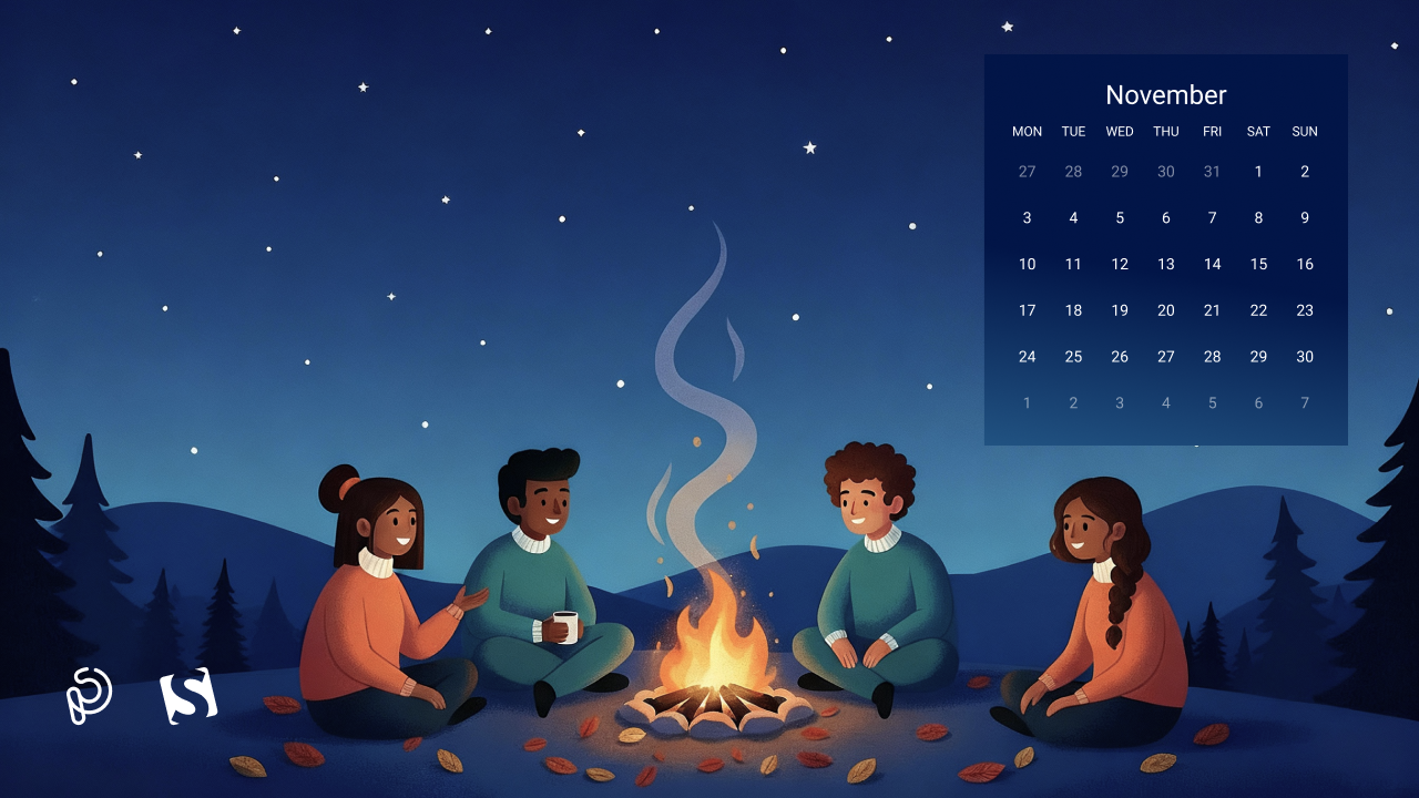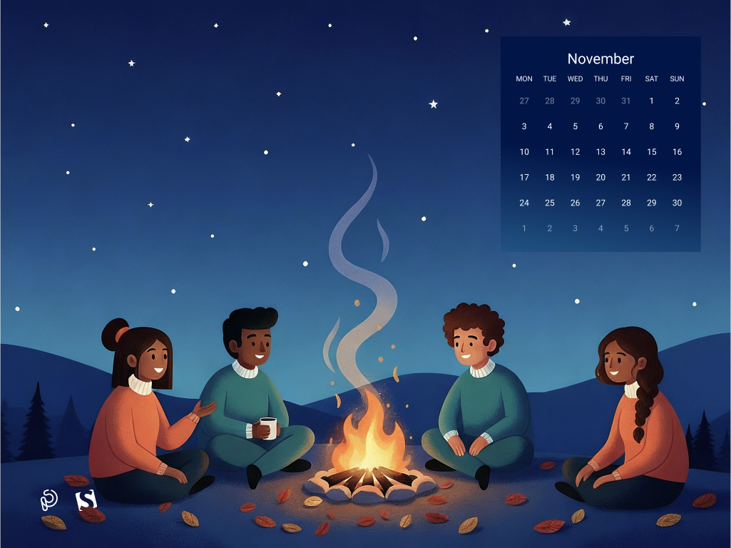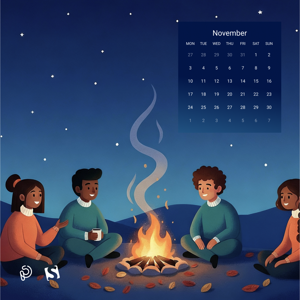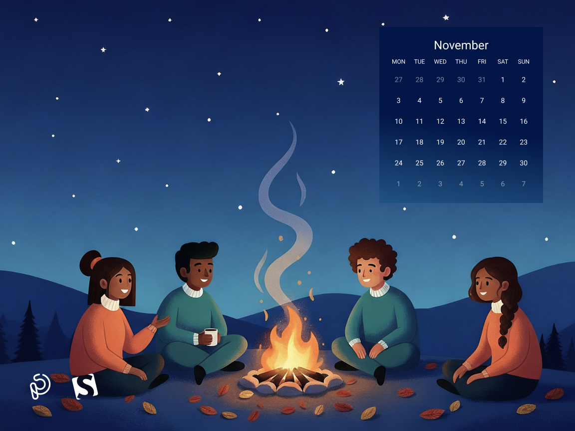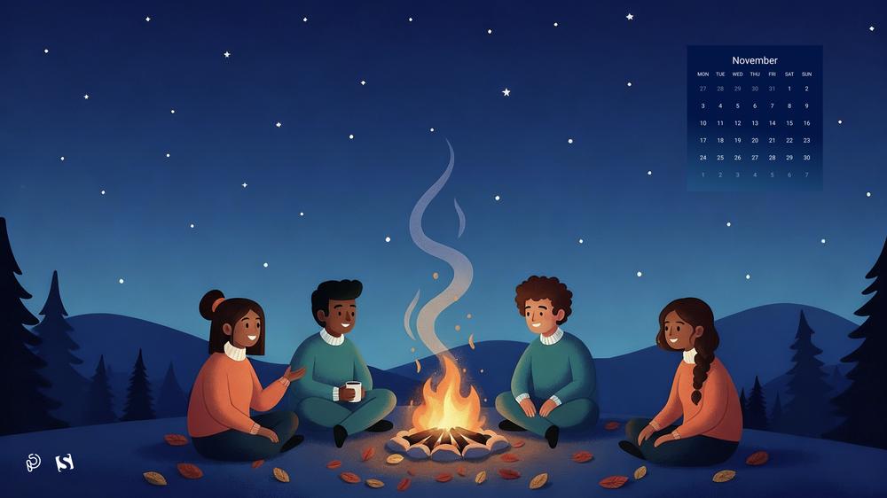A cozy autumn evening comes alive as friends gather around a warm bonfire, sharing stories beneath a starry night sky. The glow of the fire contrasts beautifully with the cool, serene landscape, capturing the magic of friendship, warmth, and the quiet beauty of November nights. — Designed by PopArt Studio from Serbia.