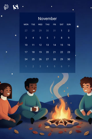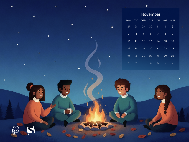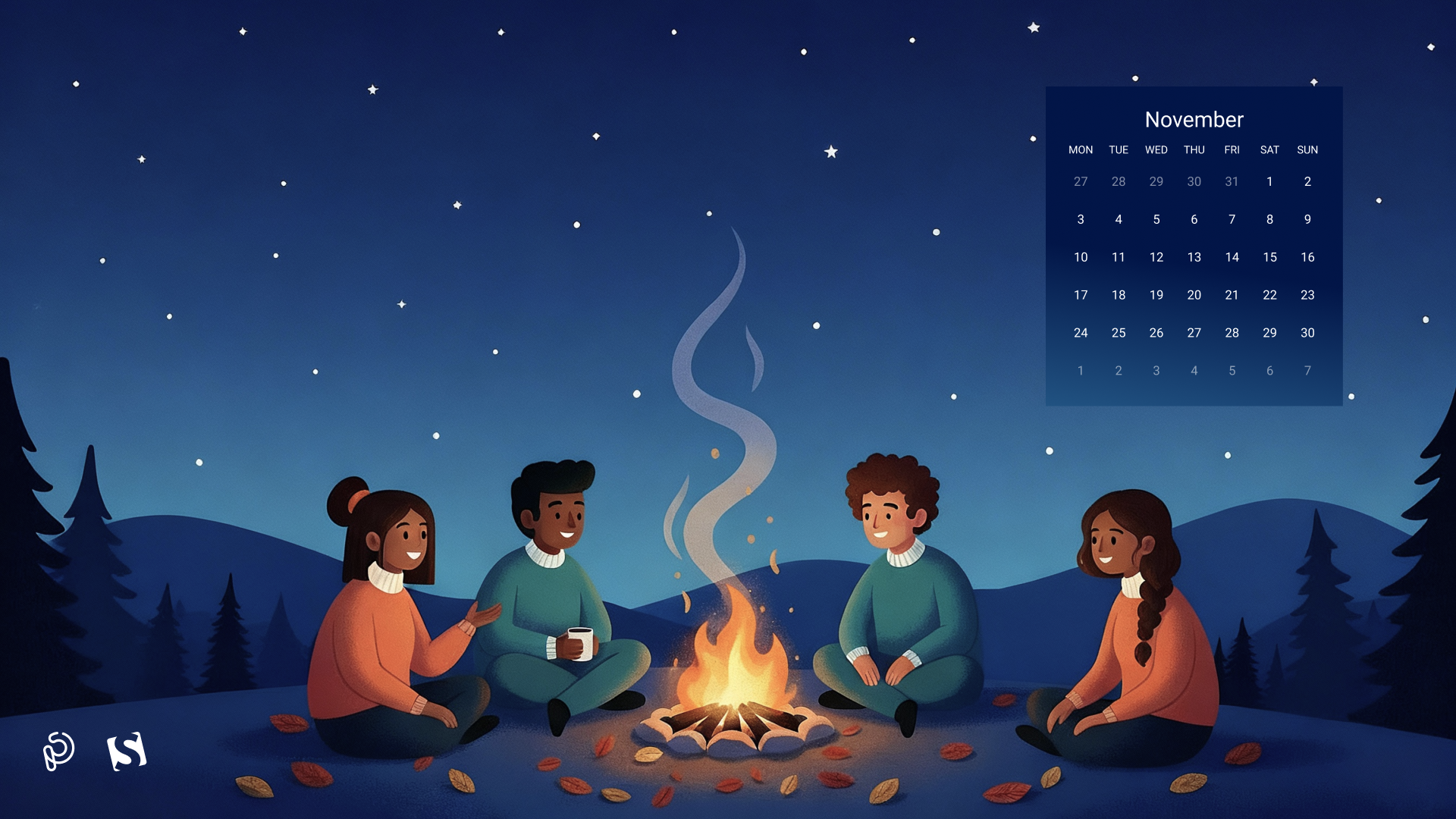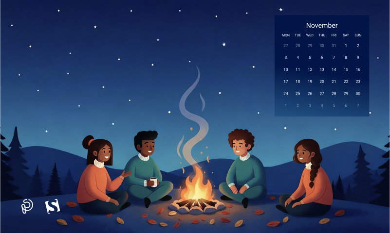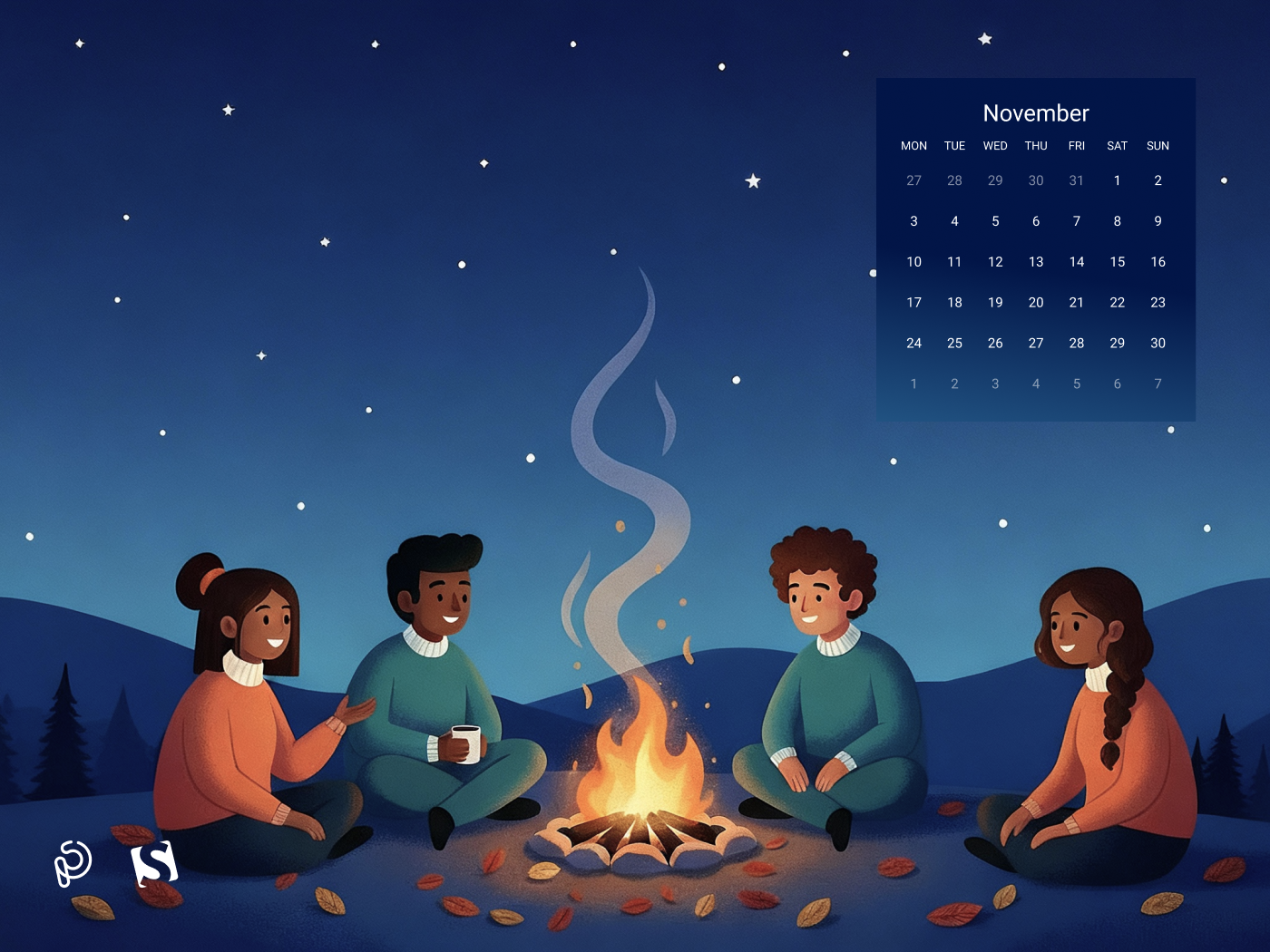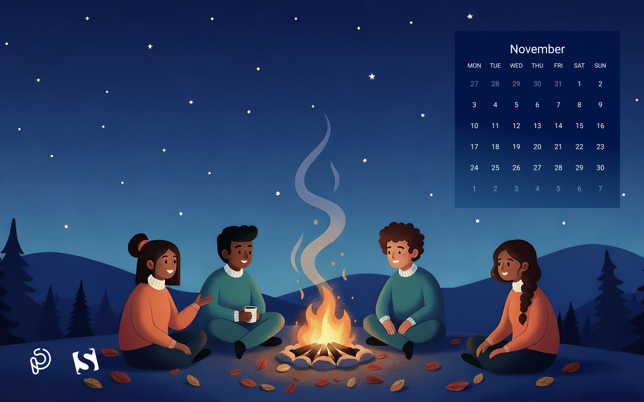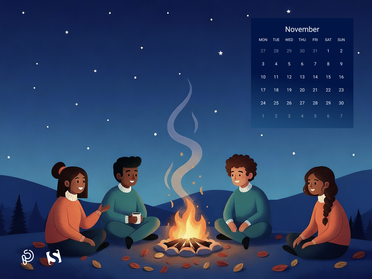 A cozy autumn evening comes alive as friends gather around a warm bonfire, sharing stories beneath a starry night sky. The glow of the fire contrasts beautifully with the cool, serene landscape, capturing the magic of friendship, warmth, and the quiet beauty of November nights. — Designed by PopArt Studio from Serbia.