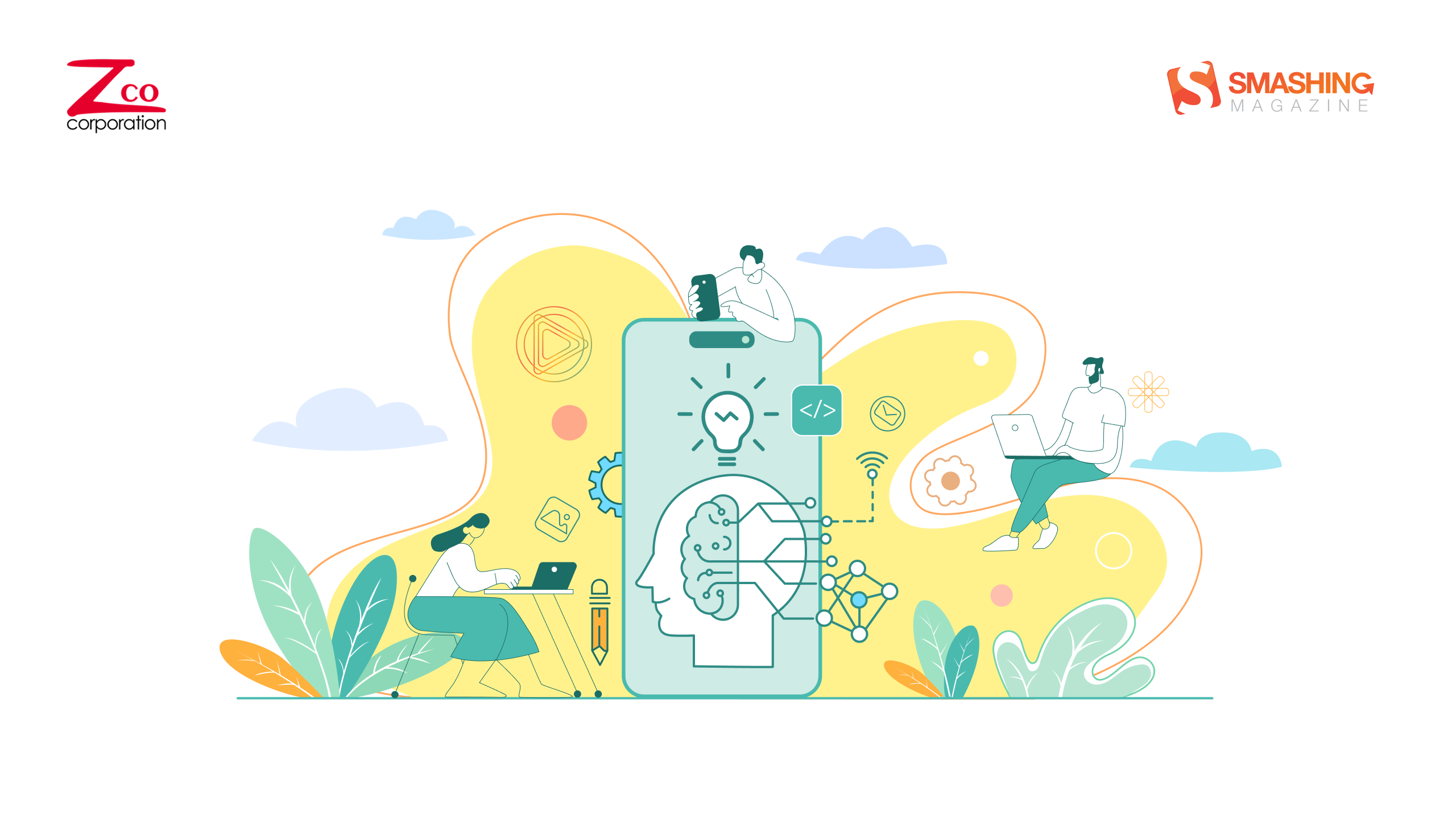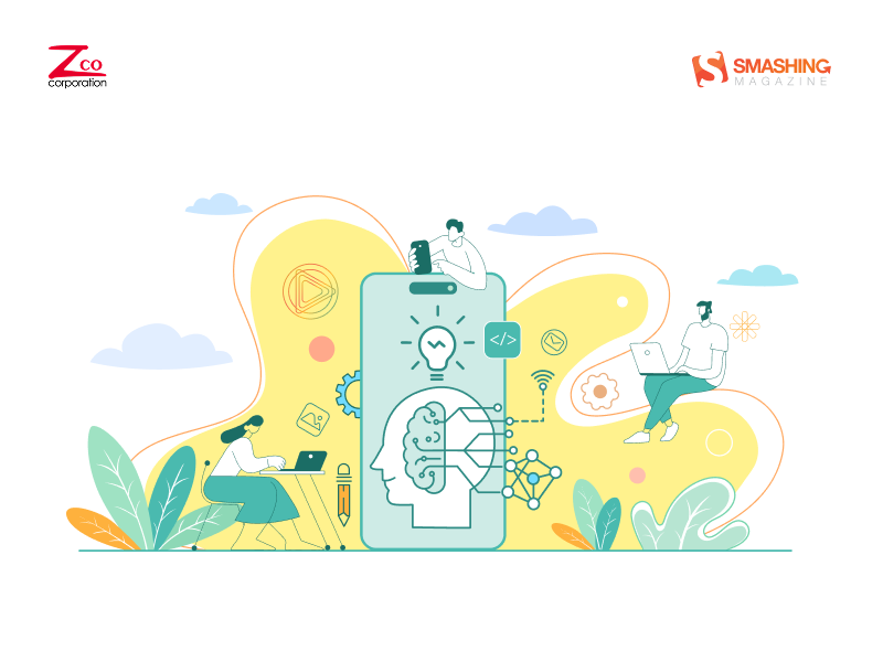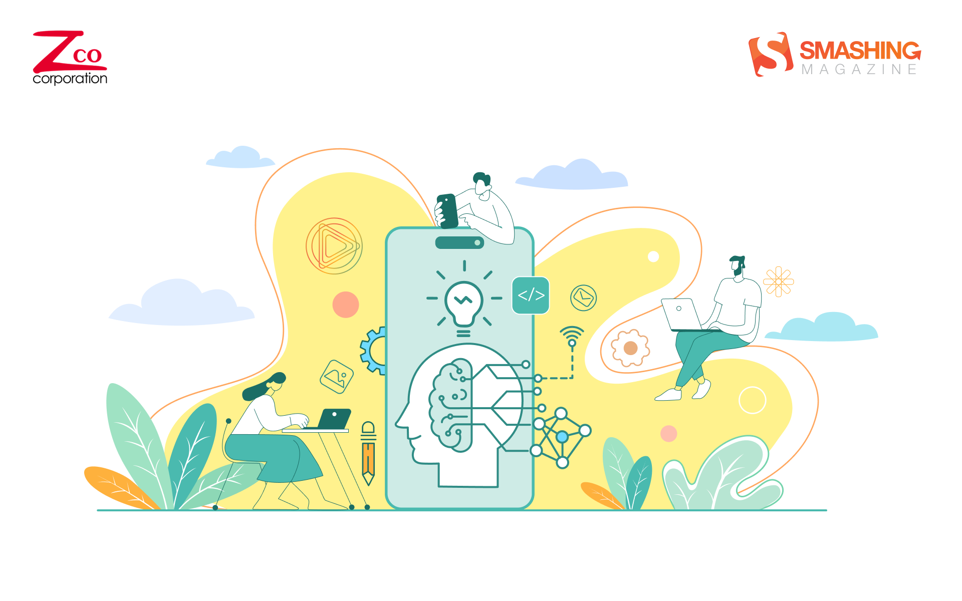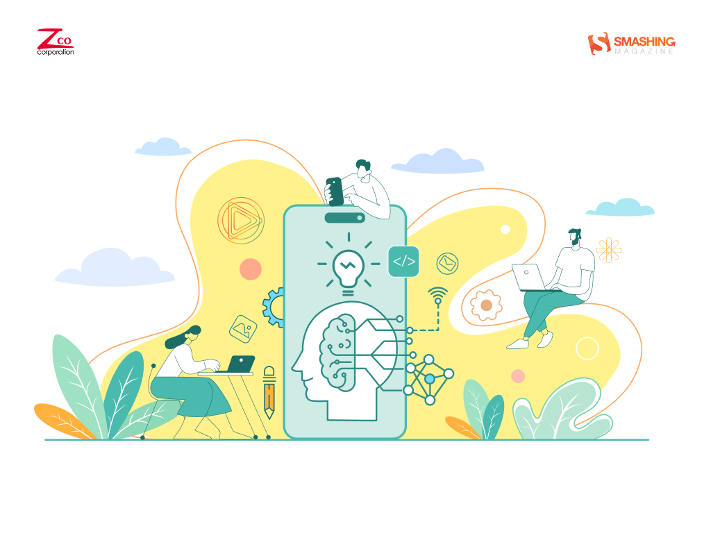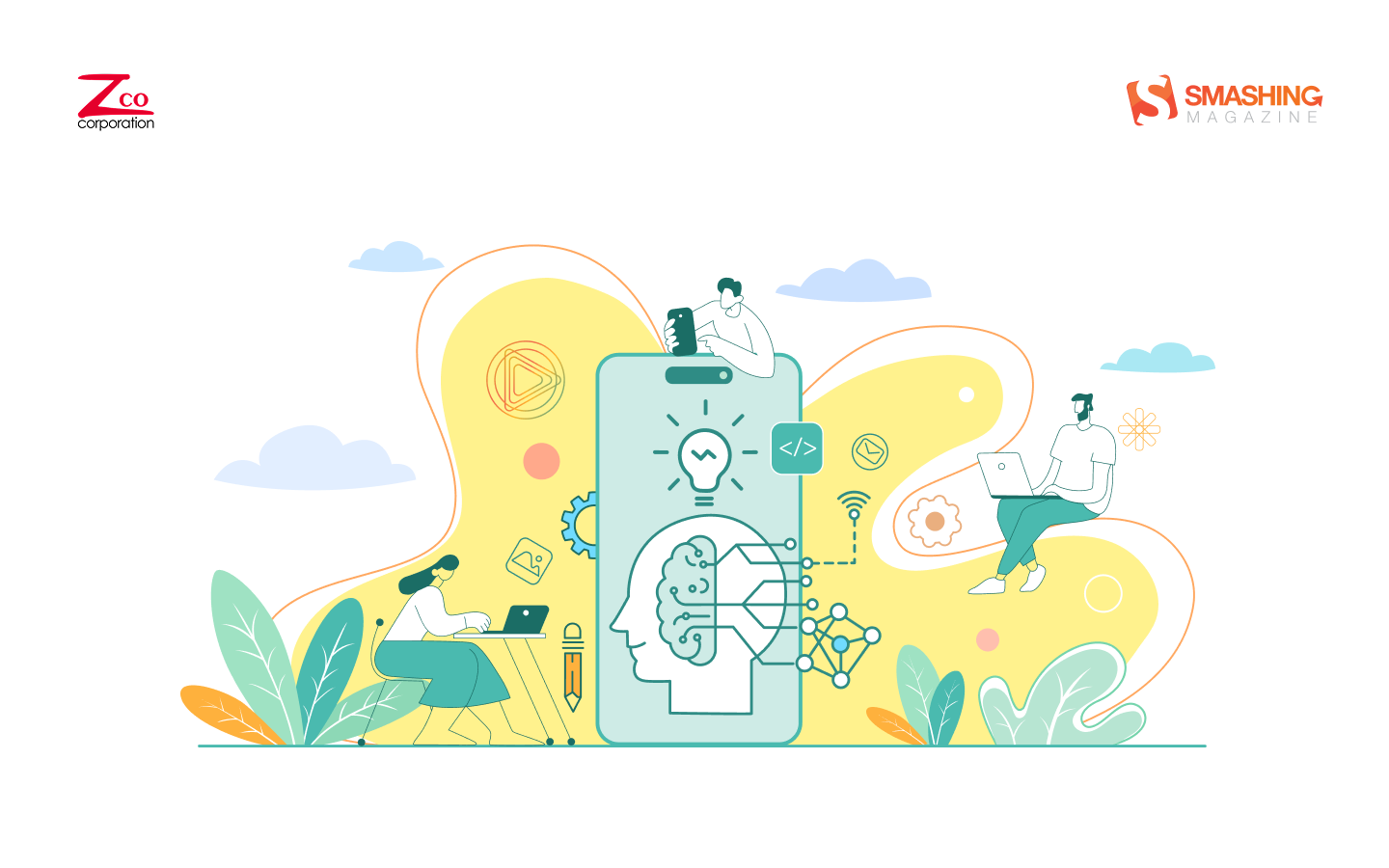This artwork blends technology and creativity in a clean, modern aesthetic. Soft pastel tones and fluid shapes frame a central smartphone, symbolizing the fusion of innovation and human intelligence in mobile app development. — Designed by Zco Corporation from the United States.