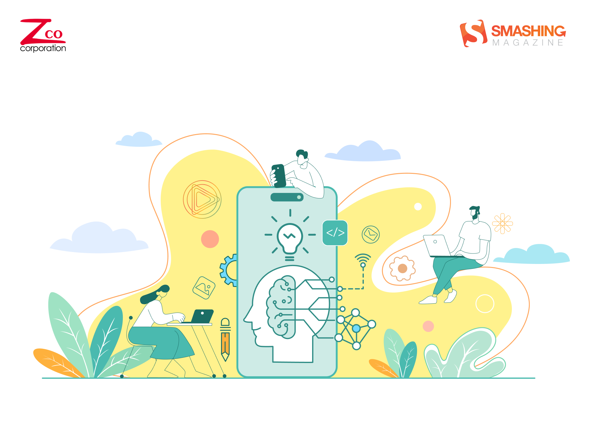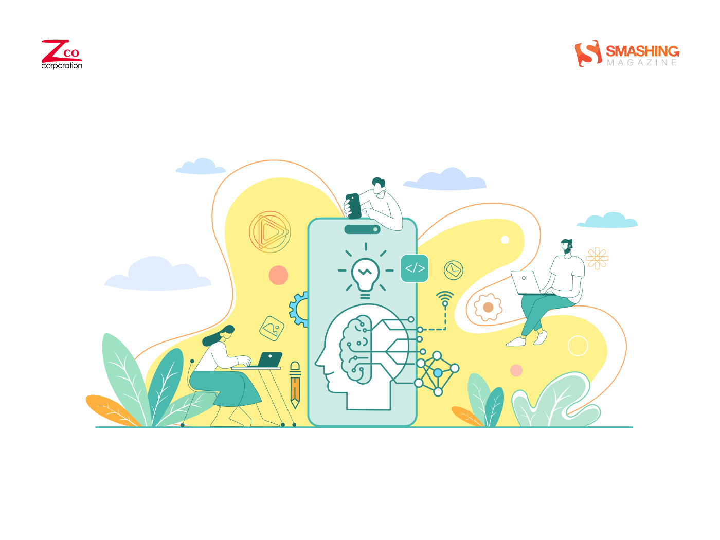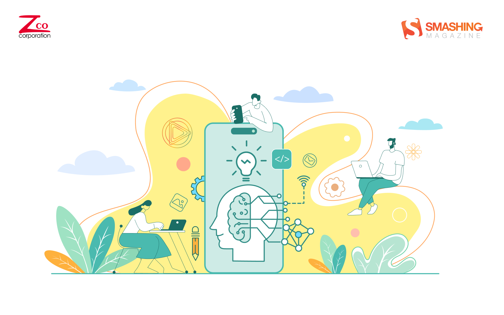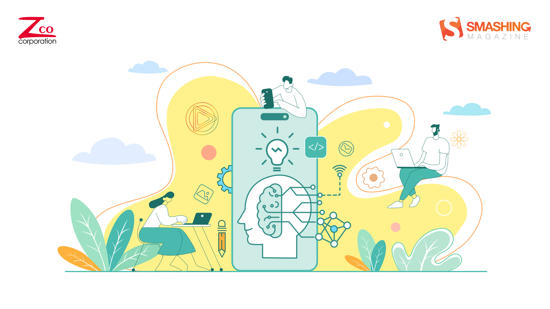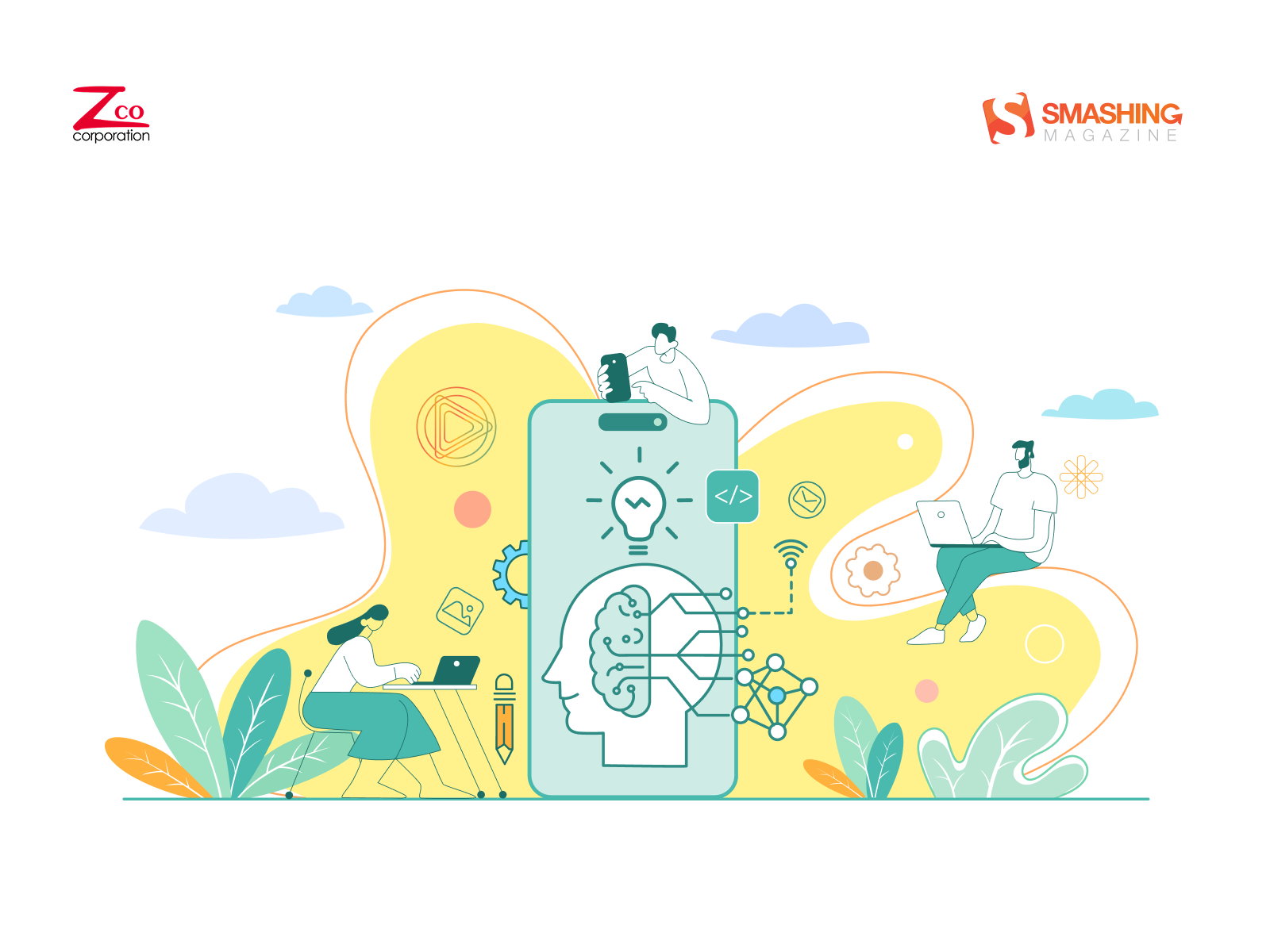 This artwork blends technology and creativity in a clean, modern aesthetic. Soft pastel tones and fluid shapes frame a central smartphone, symbolizing the fusion of innovation and human intelligence in mobile app development. — Designed by Zco Corporation from the United States.