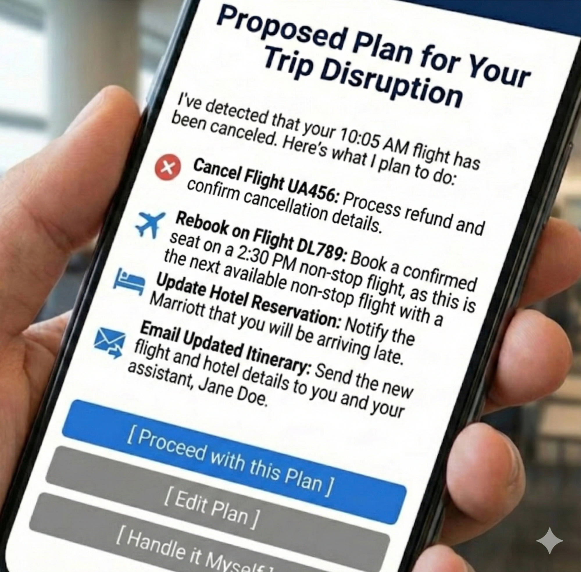 I’ve detected that your 10:05 AM flight has been canceled. Here’s what I plan to do:[ Proceed with this Plan ] [ Edit Plan ] [ Handle it Myself ]